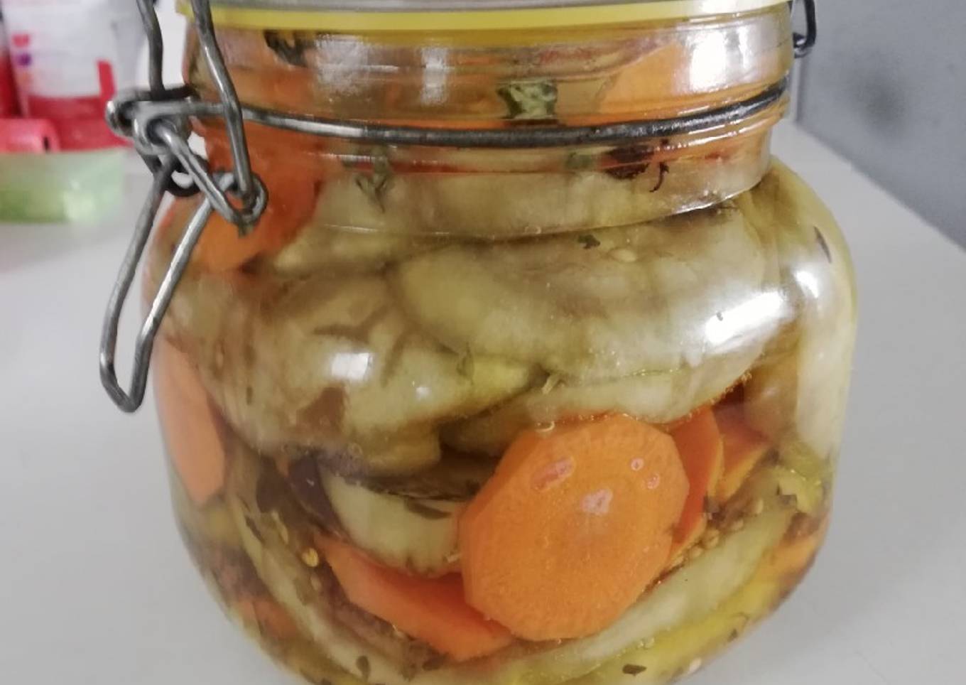 - En el pomo con la tapa seleccionado (conviene que lo hiervan para esterilizar), colocar un poco de aceite de girasol y colocar las berenjenas y zanahorias por capas, entre capas colocar los discos de ajo, hoja de laurel, pimienta negra, aj铆 (la cantidad ser谩 de acuerdo a su gusto por lo picante), deben apretarse entre capas.