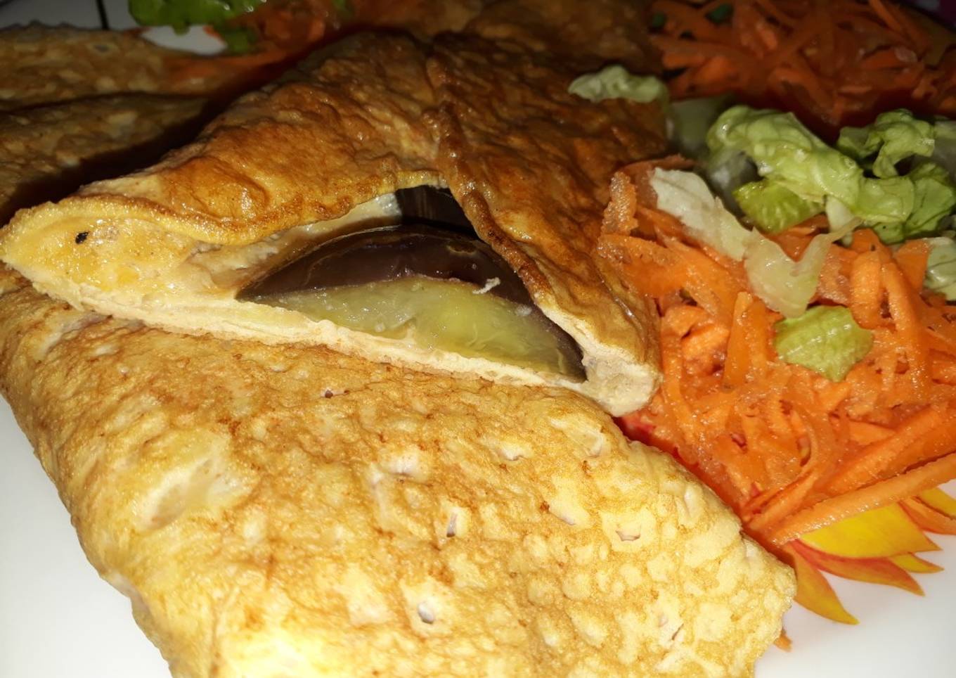 - Armás los Omelettes como siempre un cucharón de preparación en panquequera bien caliente aceitada agregás rodajas de berenjenas cuando el huevo esté a medio coágular y la papá tierna queso espolvoreado y dobla formando los Omelettes. Servimos 2 por persona(salen gorgitos) con una buena porción de ensalada A disfrutar !!!