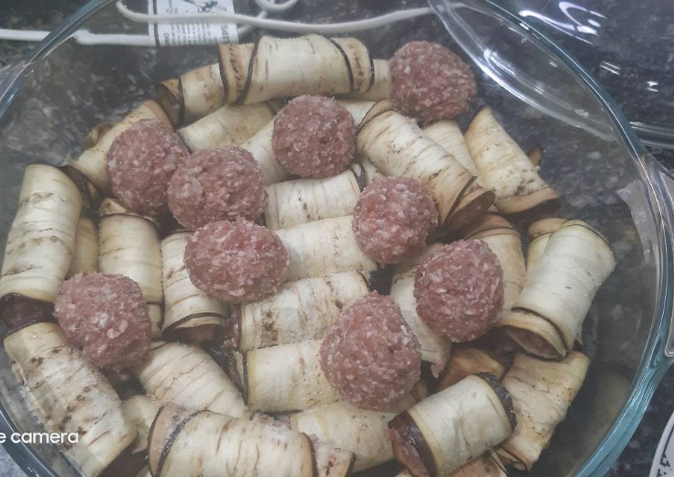 - Acomodar los rollitos en una fuente para horno (me sobró carne entonces hice pelotitas)