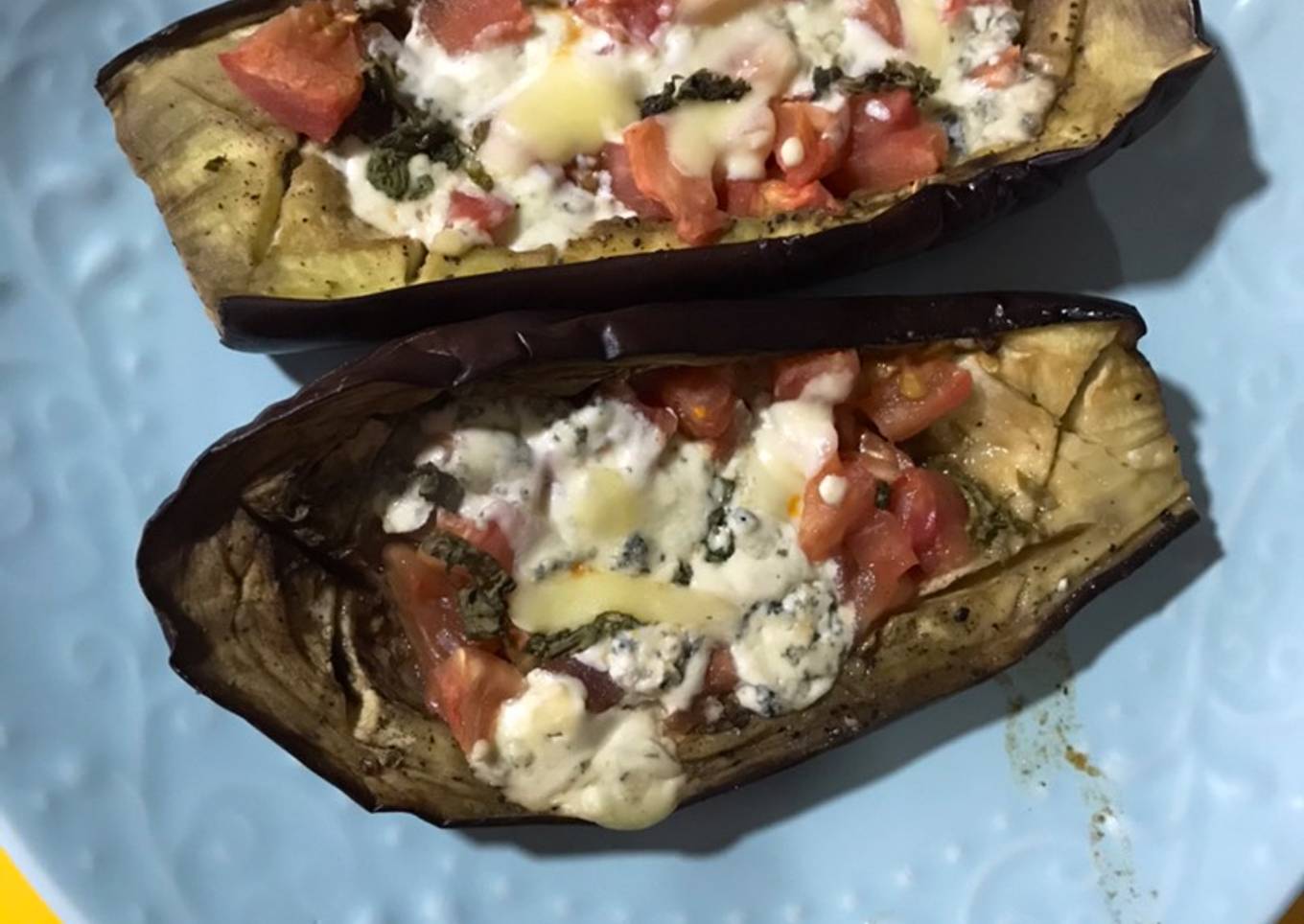 - Cuando la berenjena ya est谩 cocida se pone el tomate y arriba el queso azul y amarillo a gusto y se pone al horno para que se gratine un poquito el queso y listo! ✅
