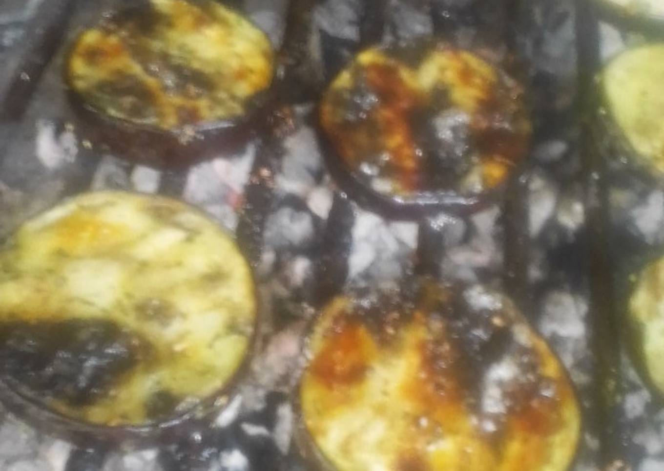 - En la parrilla poner brasa (fuego medio constante) y colocar las rodajas de berenjena. El lado del aceite hacia abajo
