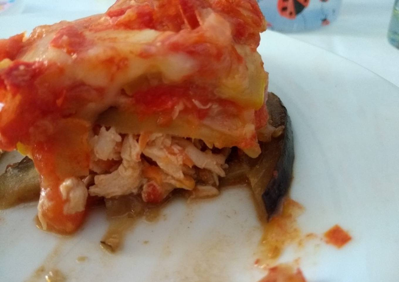Lasagna de berenjenas rellenas de pollo, jamón y queso