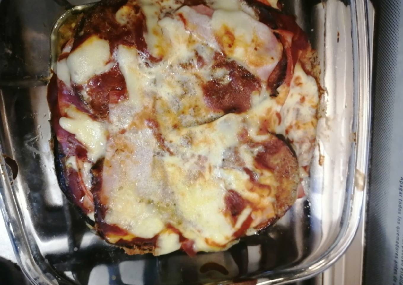 - Colocar una capa de berenjena, encima salsa tomate, queso, jamón y tomate en rodajas finas.