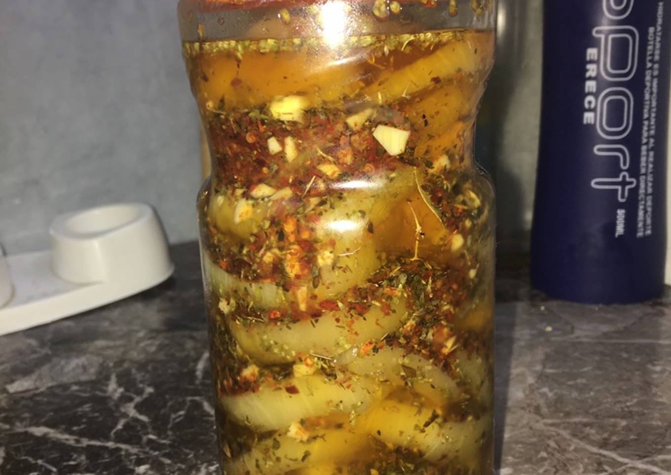 - Cortamos en pedacitos los ajos, le agregamos ají molido, orégano, aceite y un poquito de vinagre.