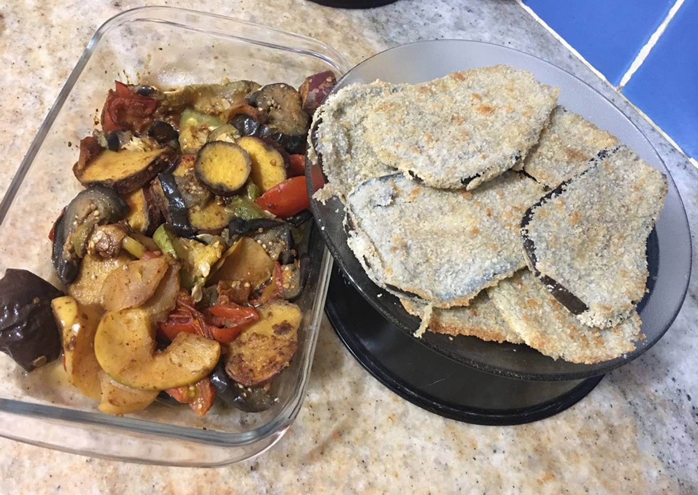Berenjenas en milanesa con verduras salteadas