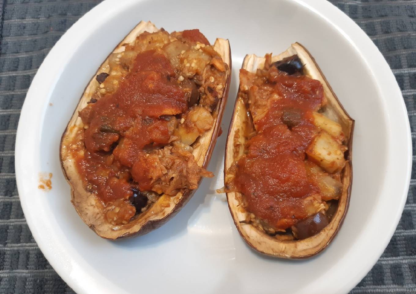 - Una vez todo listo, rellenar las berenjenas con el preparado anterior. Agregar por encima la salsa de tomate (como opcional le pueden agregar también queso por encima o huevo) y por último los condimentos. Llevar a horno unos 5 min más y listo!