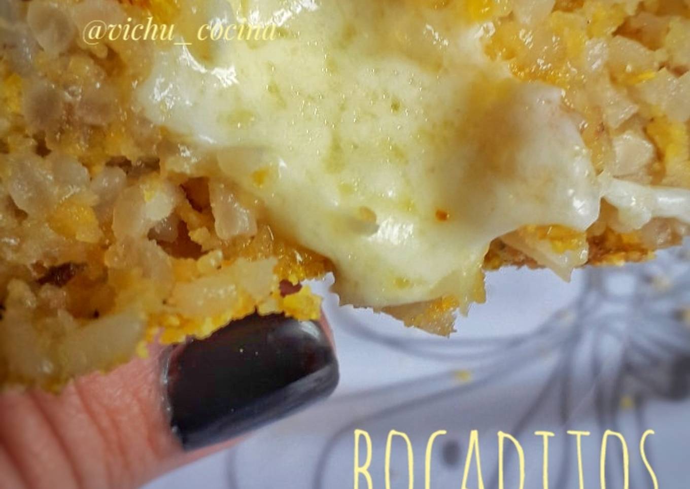 - Armar los bocaditos y ponerle un trozo de muzarella en su interior. Rebozar con polenta
