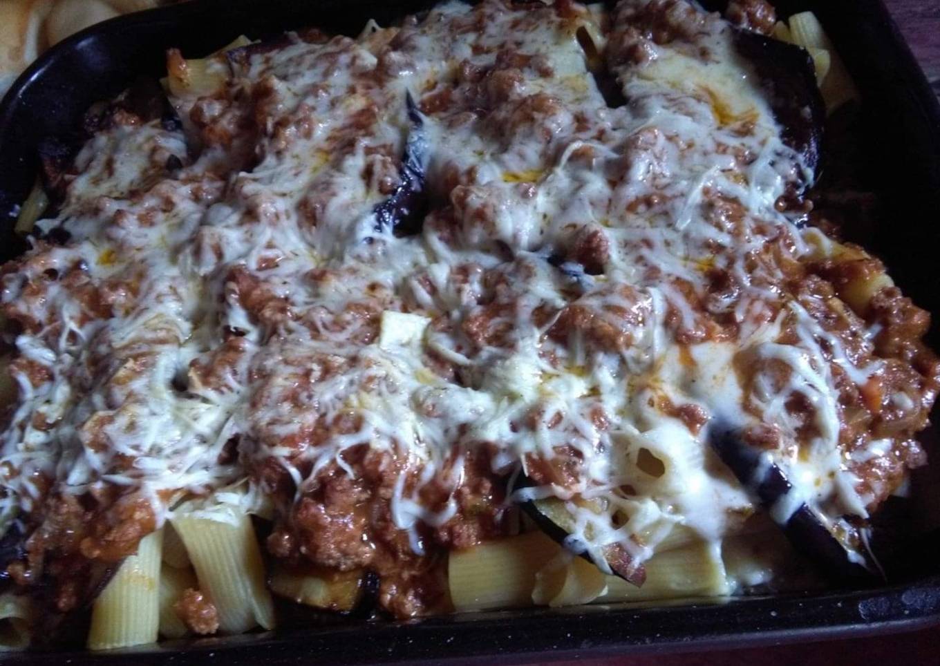 - Ahora a preparar, en una chapa, agregamos un poco de tuco, una capa de fideos, berenjena, queso fresco, tuco, fideos, berenjena, queso fresco, tuco, fideos, berenjena, queso.. una vez que terminamos con la última capa yo le agrego el tuco restante, y le rayo abundante queso.
