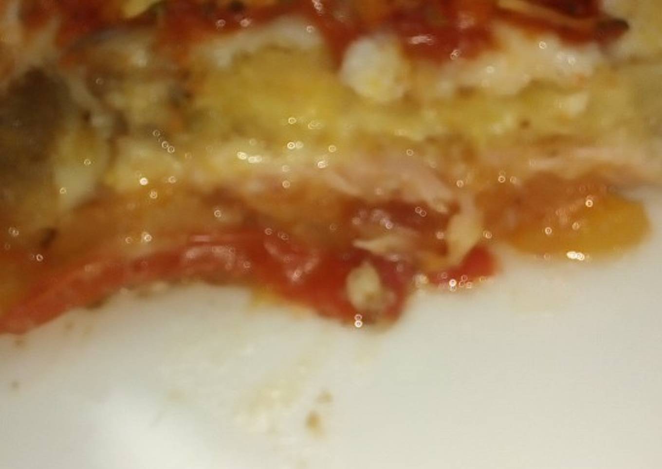 - Cubrir con jamón y luego con queso.Cubrir nuevamente con el resto de berenjena.
