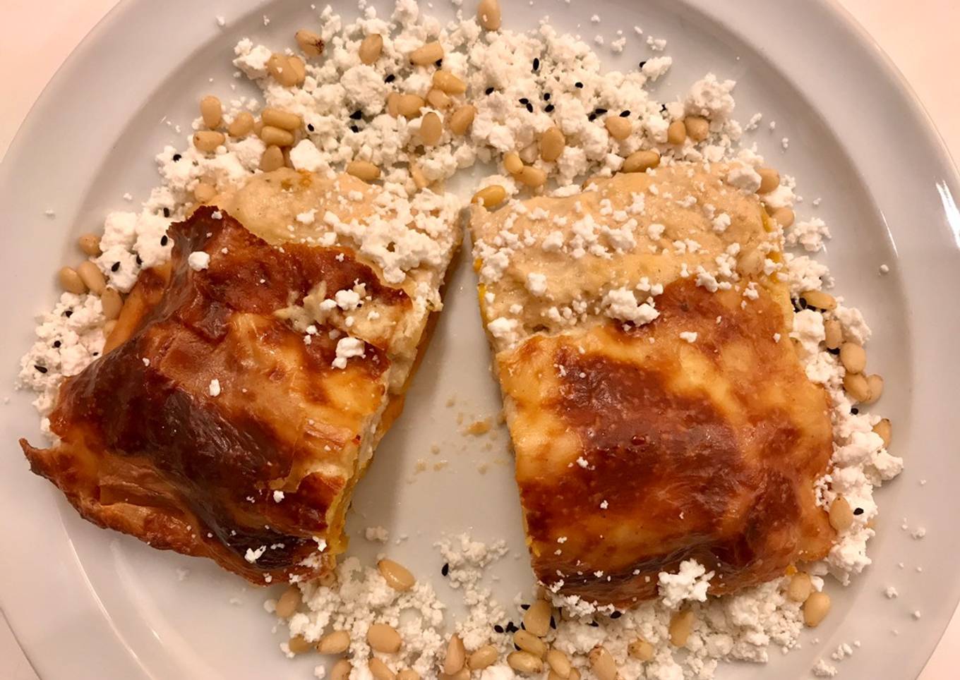 - Los canelones los emplatas y alrededor echas el queso en grumos junto con el sésamo negro y los piñones.