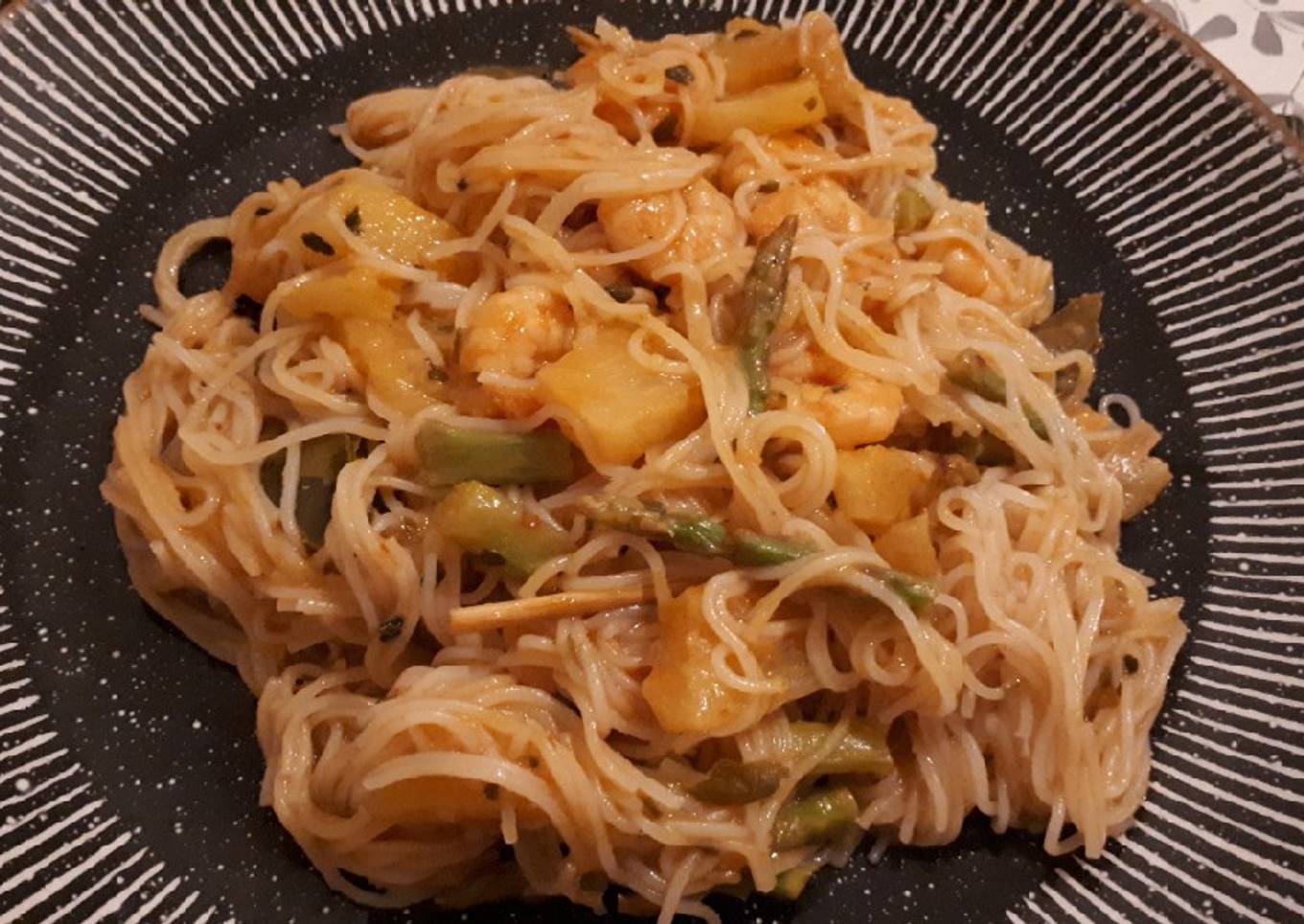 - Y ya tenemos este riquísimo curry laksa de calabaza con piña, espárragos y gambas, que podemos servir con fideos de arroz.
