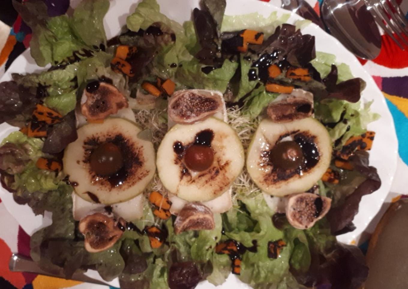 Ensalada festiva con calabaza, manzana verde, higos y queso de trufa