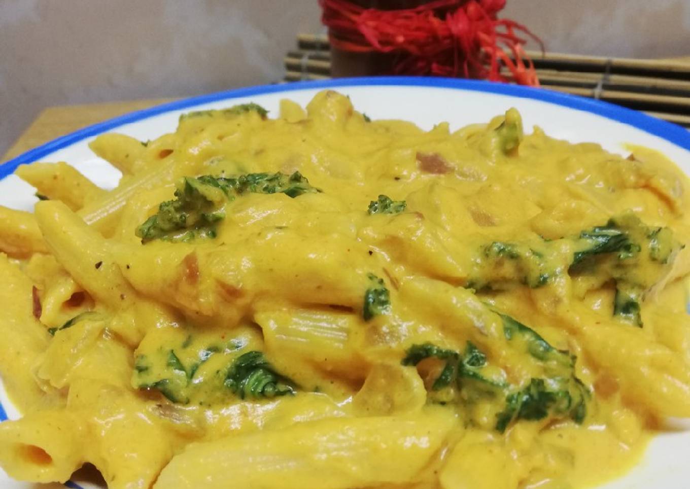 Pasta Integral con salsa de calabaza y kale