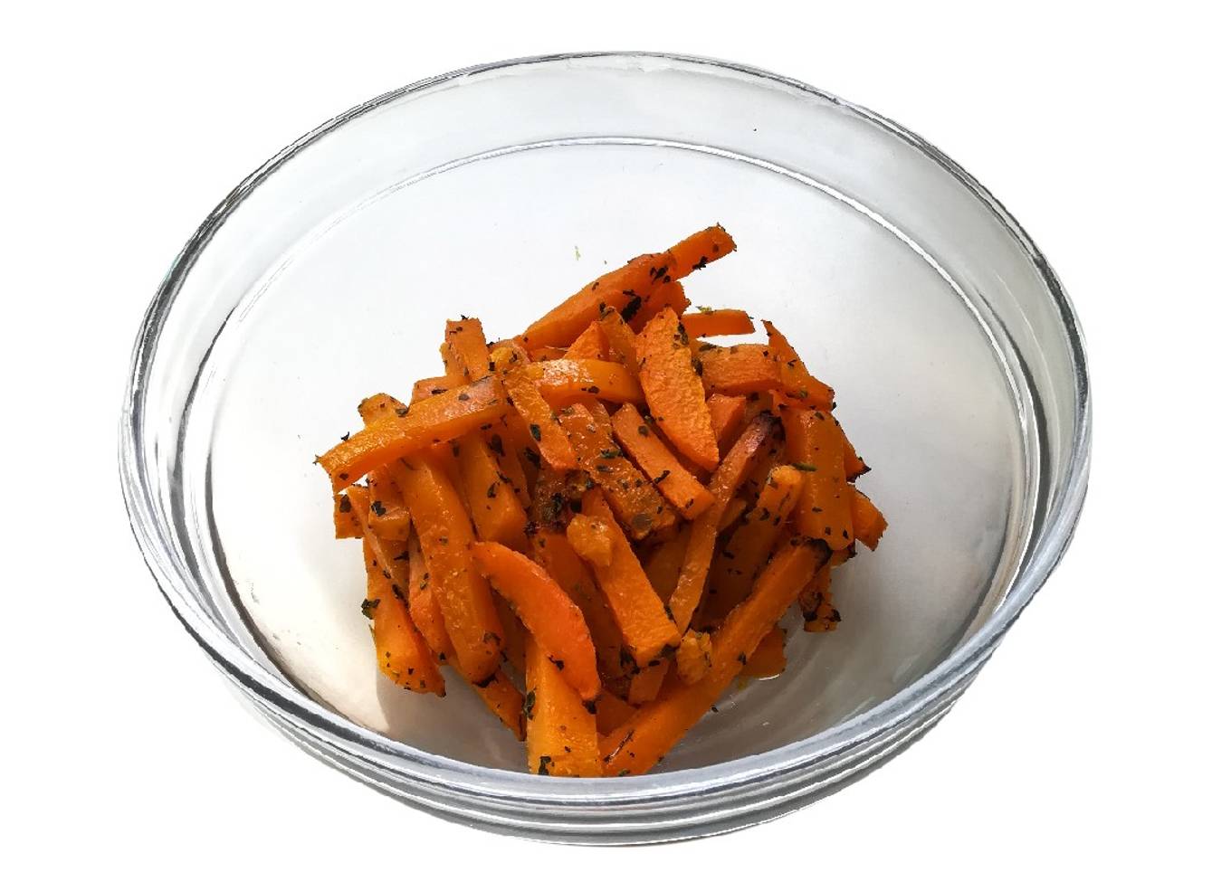 - A continuación, cortamos la calabaza en pequeños palitos de 1cm de grosor por 15 cm de largo, los echamos en un cuenco o recipiente hondo e incorporamos un poco de pimienta blanca y orégano, mezclamos todo bien con la mano y las disponemos en la bandeja (aderezamos con un chorrito de aceite y si queréis con una pizca de sal).