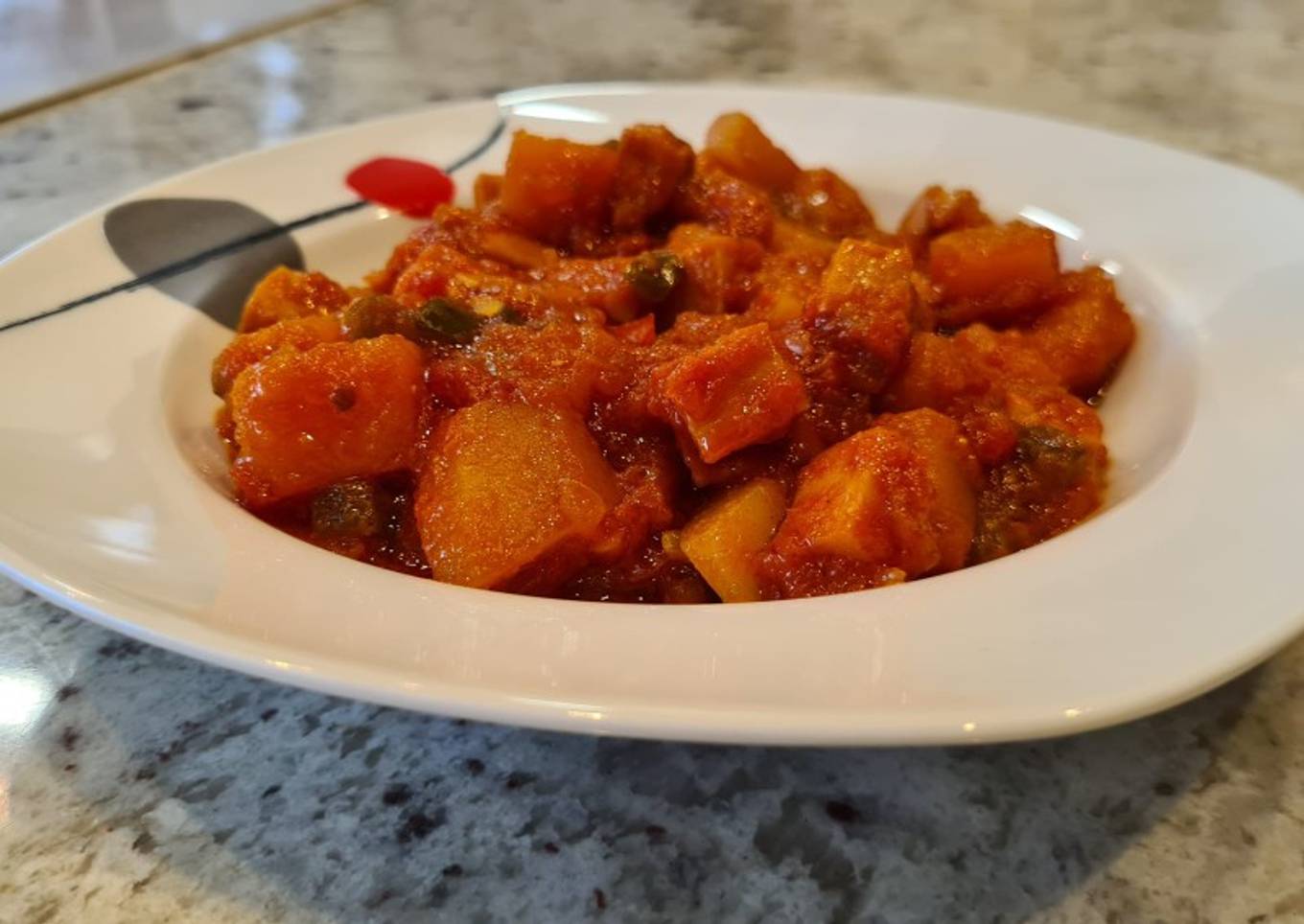 Vamos a darle un pequeño giro al típico pisto, simplemente agregándole un poco de calabaza y unos dados de fiambre de pechuga de pavo. Es una receta muy sencilla, con mucho sabor y que en casa gustó mucho, la comí hasta yo que no me simpatizan mucho los pimientos. ¿Os animáis a hacerla?