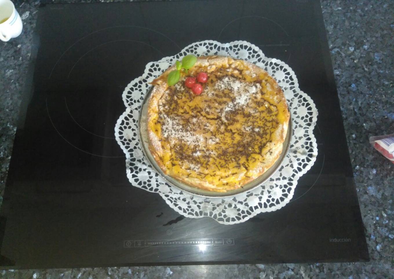 - Poner en el fuego, suave incorporar la nata y la mantequilla, cuando este ya la masa que tenemos en el horno 180ºC, incorpora la mezcla y se hornea con calor arriba y abajo hasta que este cuajada.