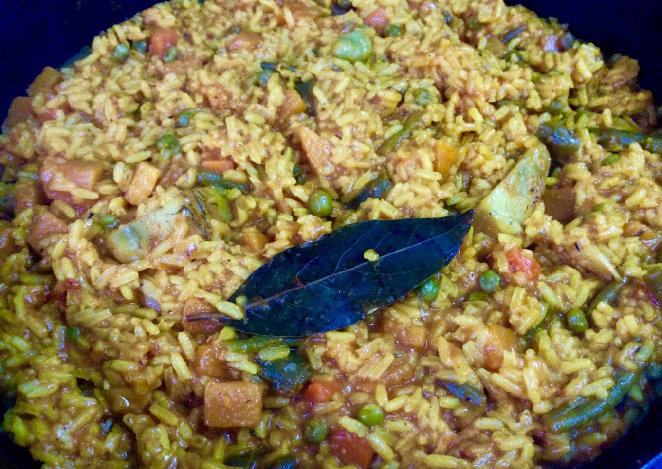 Un arroz vegetal que puede funcionar tan bien como uno tradicional con su carne y pescado. Si elegimos las verduras adecuadas y la aderezamos con las especias que más potencien su sabor, el resultado será tan saludable como satisfactorio. Llama la atención especialmente lo bien que combinan las alcachofas con la calabaza dulce, muy sabroso. Una receta apta para veganos.