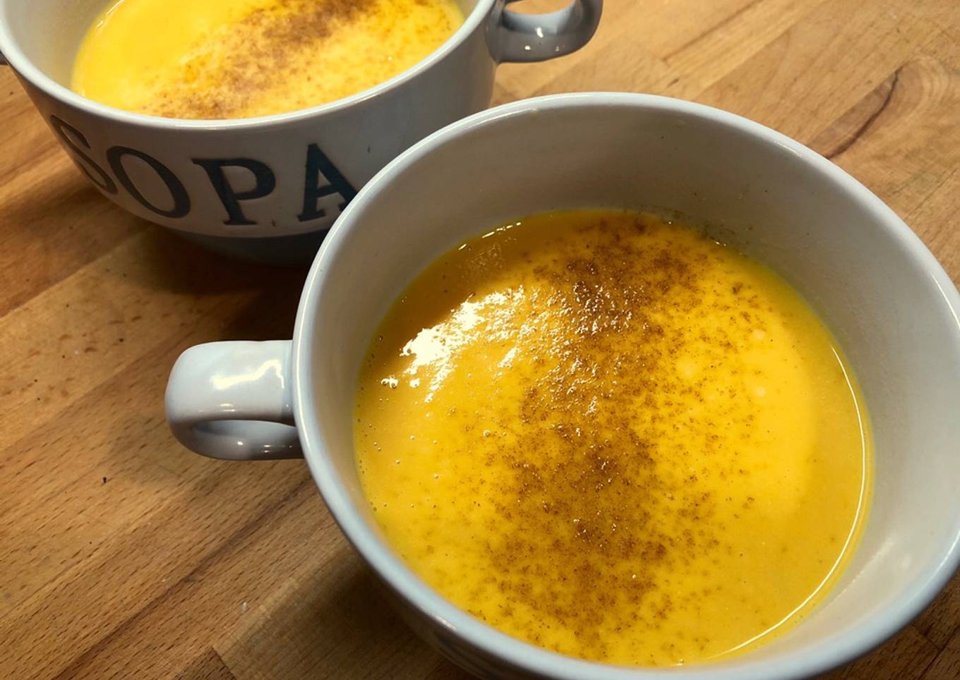 - Cuando se enfríe un poco, quitar las pepitas y con la ayuda de una cuchara, sacar la pulpa y colocarla en una olla. Añadir el caldo y cuando hierva, un chorrito de leche evaporada.