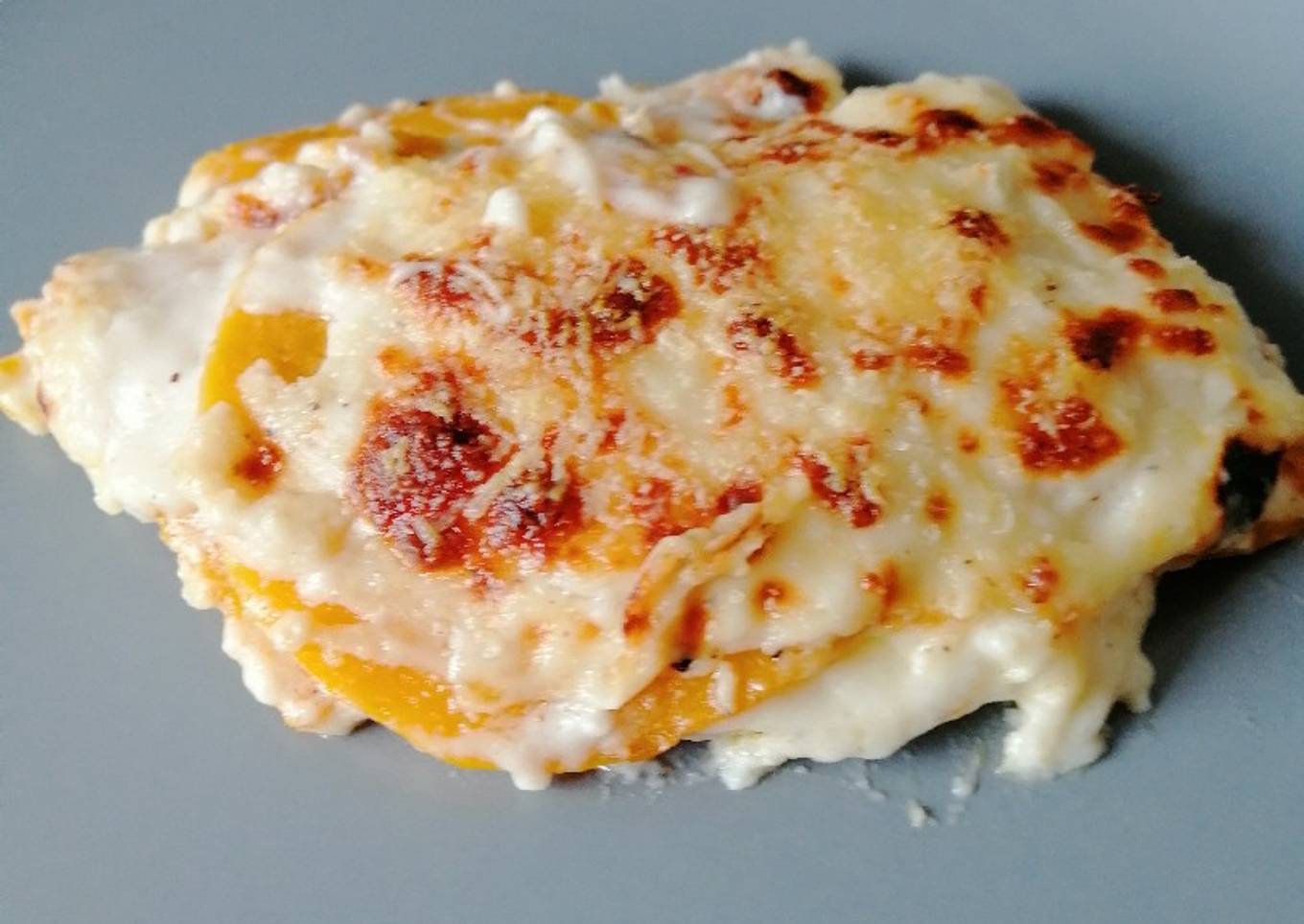 - En una fuente apta para el horno poner una base de bechamel. Cubrir con una capa de calabaza.