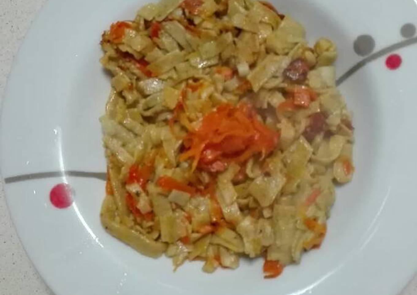 - Pochar tiras finas de zanahoria en una sartén antiadherente incorporando ajo picado si se quiere. Incorporar la pasta cocida y mezclar todo unos minutos añadiendo un chorrito de aceite de oliva.