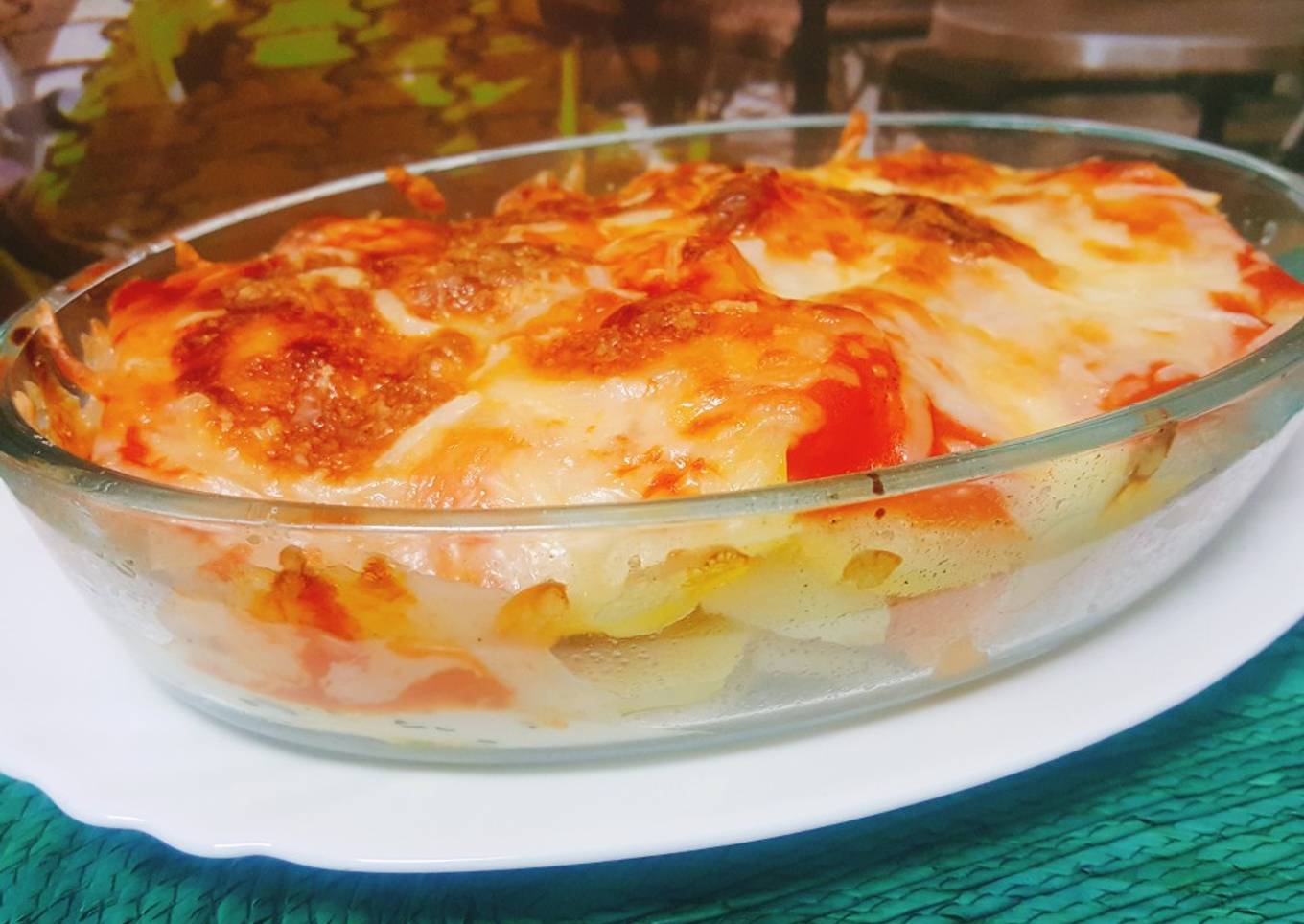 - Una última capa de patatas en rodajas, salpimentar y cubrir con el tomate frito o nata para cocinar. Esparcir el queso y llevar al horno precalentado a 200° durante 20-25 minutos.