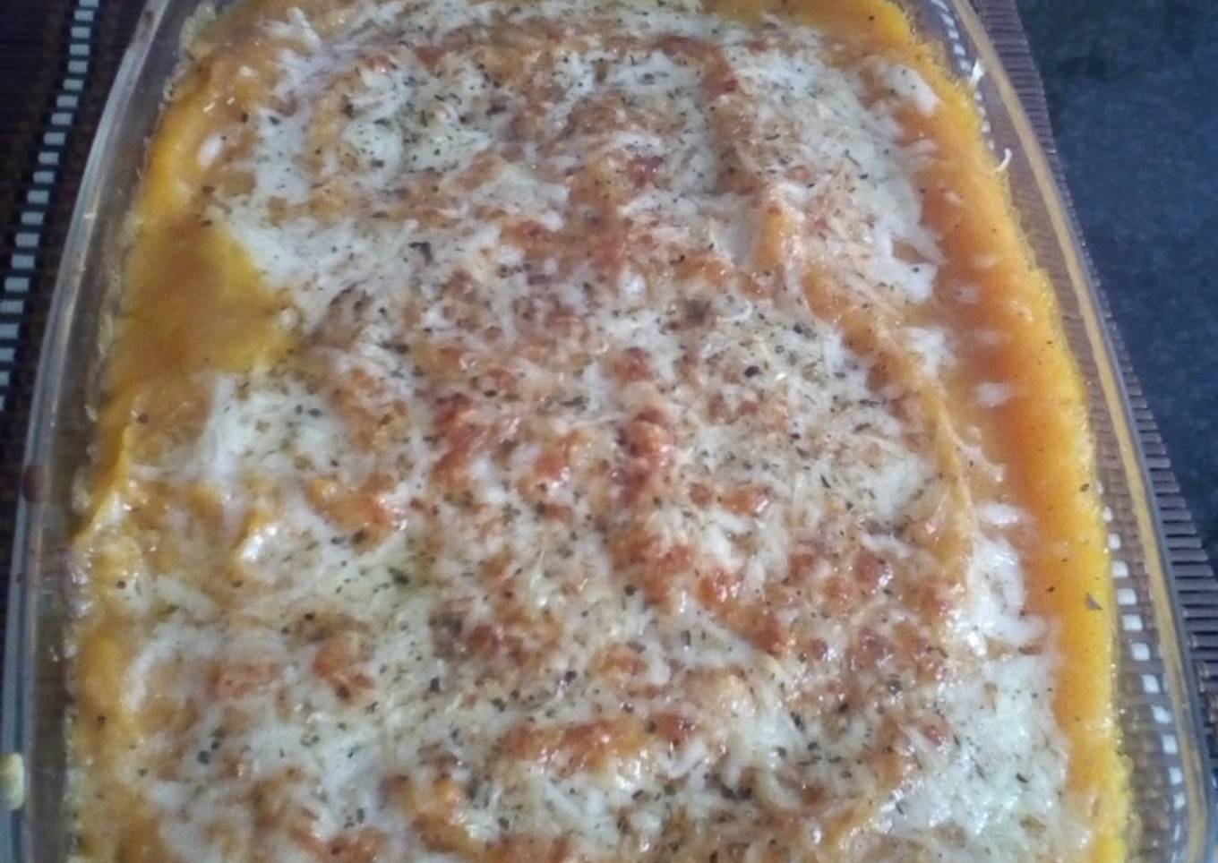 - En un recipiente de cristal apto para horno verter la carne de pollo y extender bien. Encima poner el puré de calabaza- patata y extender. Encima espolvorear el queso parmesano rallado y rociar la fuente de cristal con las hierbas provenzales