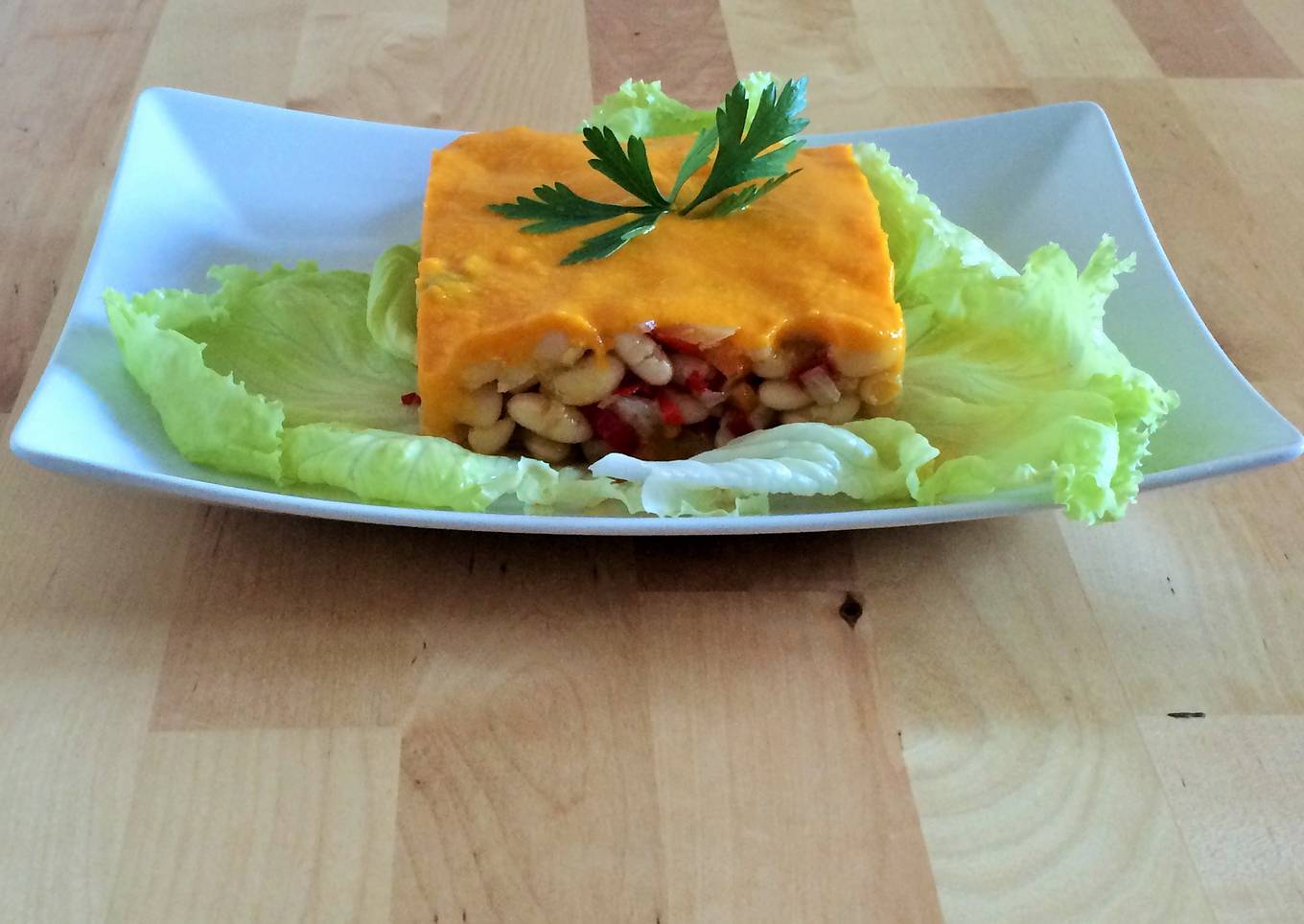 - Para servir, disponer en un plato con la ayuda de un molde de cocina, las alubias y cubrir con la brandada de calabaza.