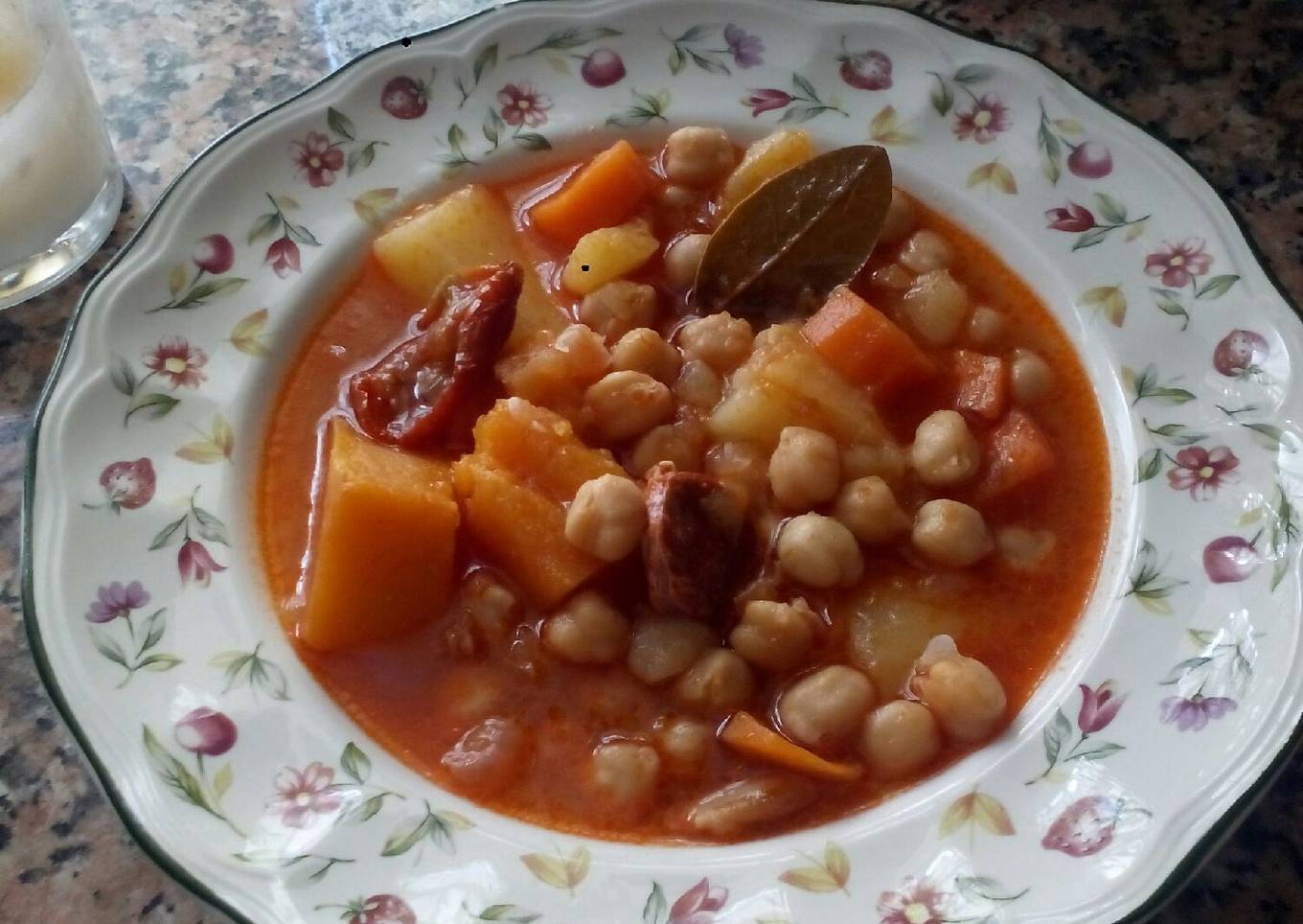 - Se sofrie la cebolla luego hechamos el chorizo ,calabaza en trozitos ,el tomate seco,el laurel,lás patatas y por ultimo los garbanzos enjuagados,se les cubre de agua una pastilla de avecren el pimenton y a la olla rapida 10 minutos y listo.