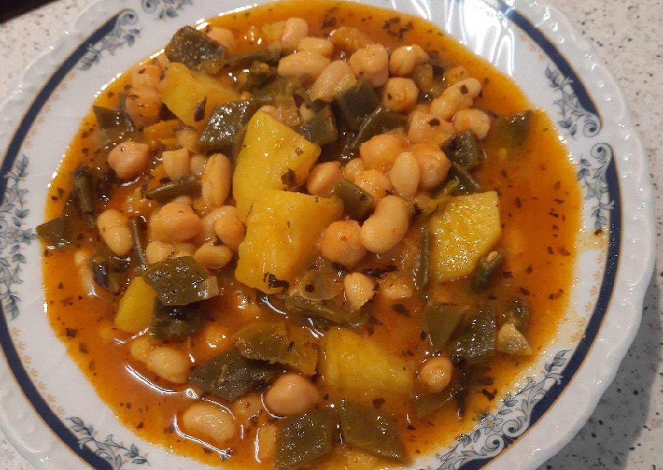 - A dejamos hervir unos 15, o, 20 minutos le agregamos la hierbabuena y el azafr谩n y pasados los 15 minutos le ponemos las habichuelas y la sal y que hierva hasta que est茅n las patatas hay que probar para ver como va de sal y listo
