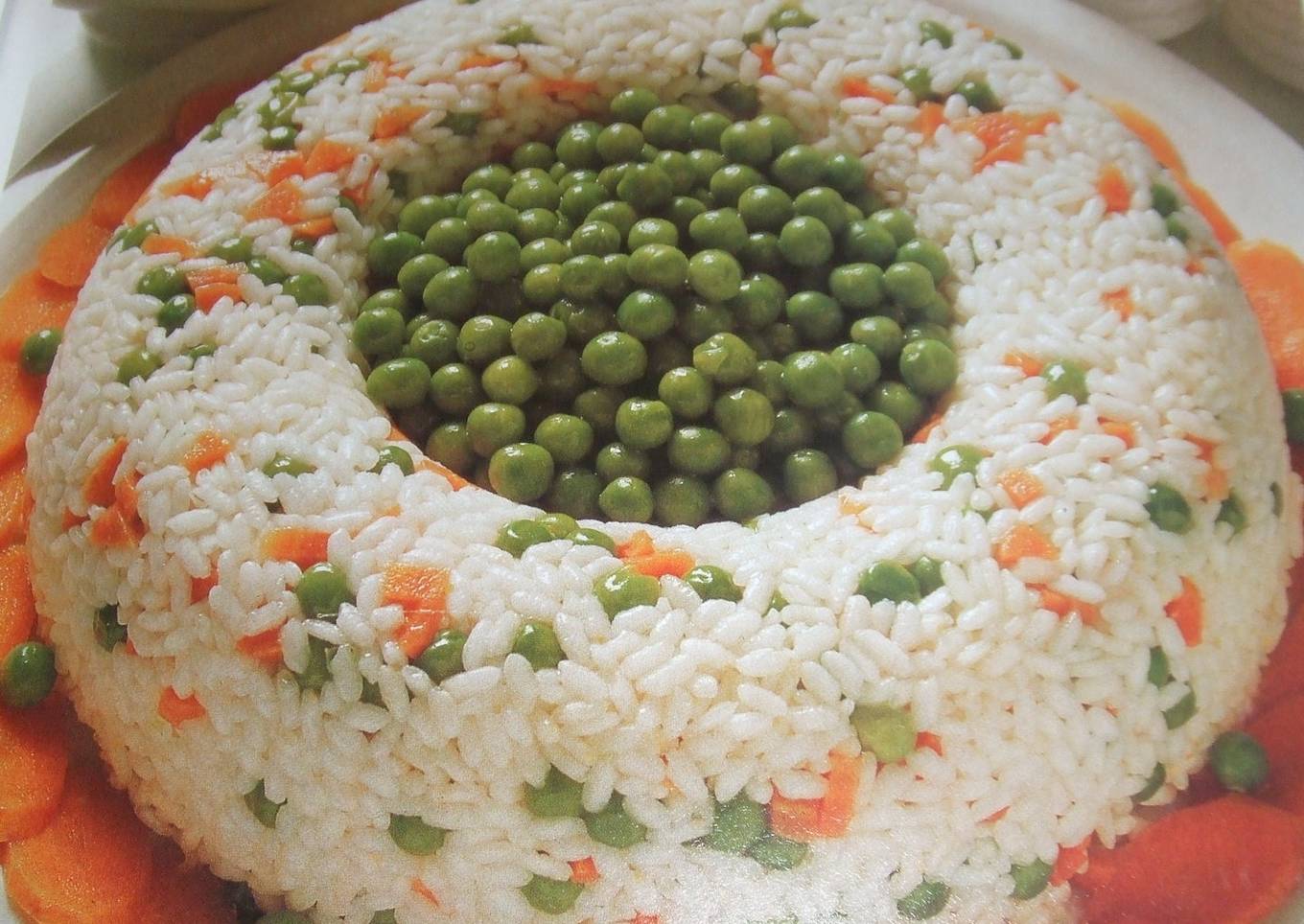 - Mojar un molde de corona y colocar la preparación. Dejar unas 3 horas en el frigorífico. En el momento de servir desmoldar en una fuente de servicio, colocar los guisantes en el centro y la zanahoria alrededor.