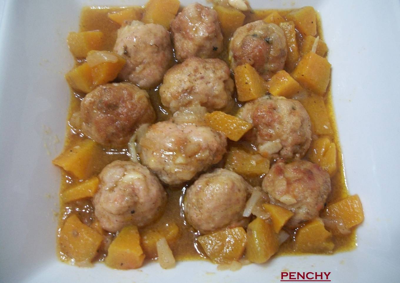 Una salsa de pelotas Murcianas, o albóndigas, aquí las llamamos así, en una salsa suave acompañada de calabaza , queda un plato muy rico y mas sano y suave con las verduras.