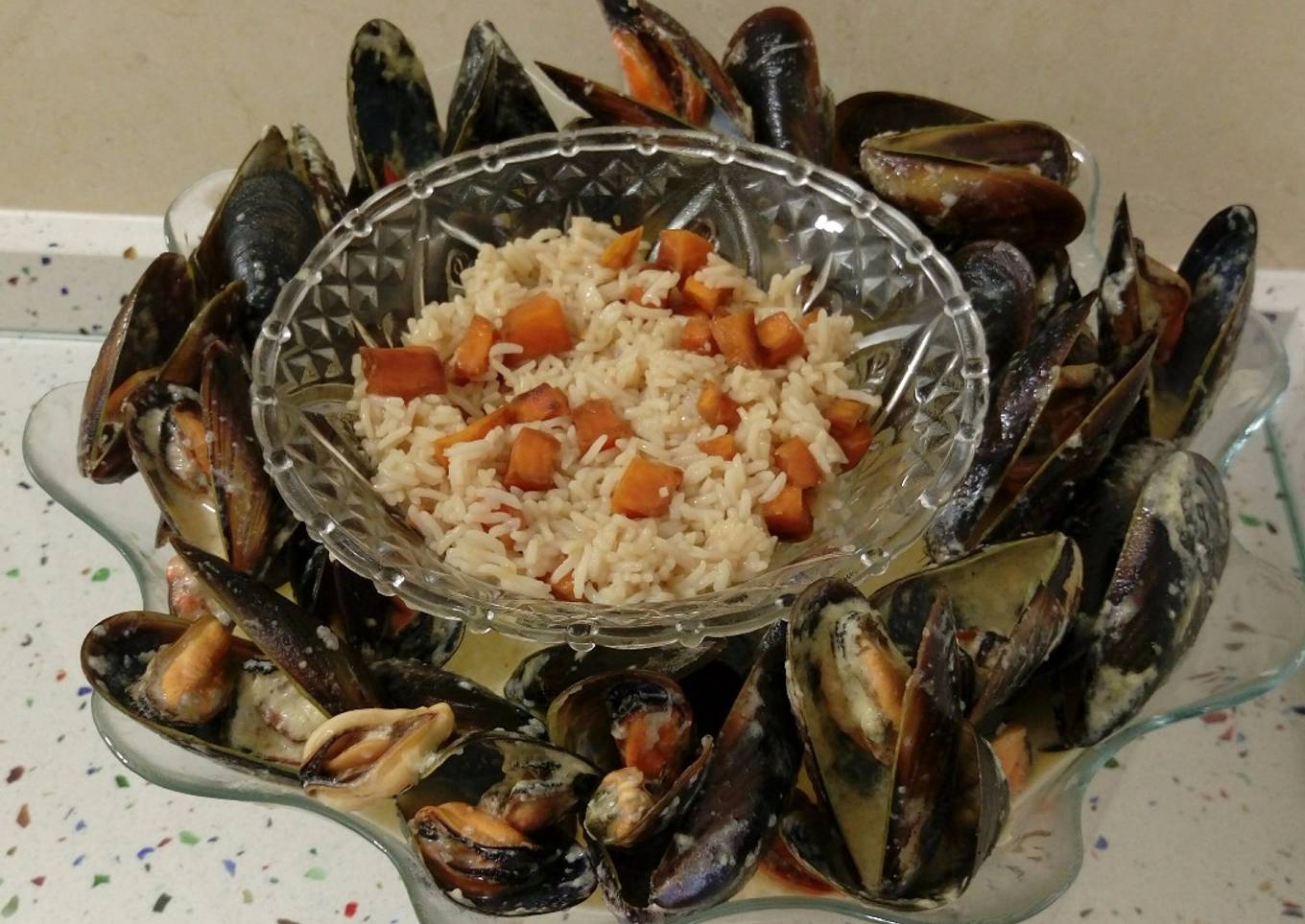 Mejillones en salsa y arroz con calabaza
