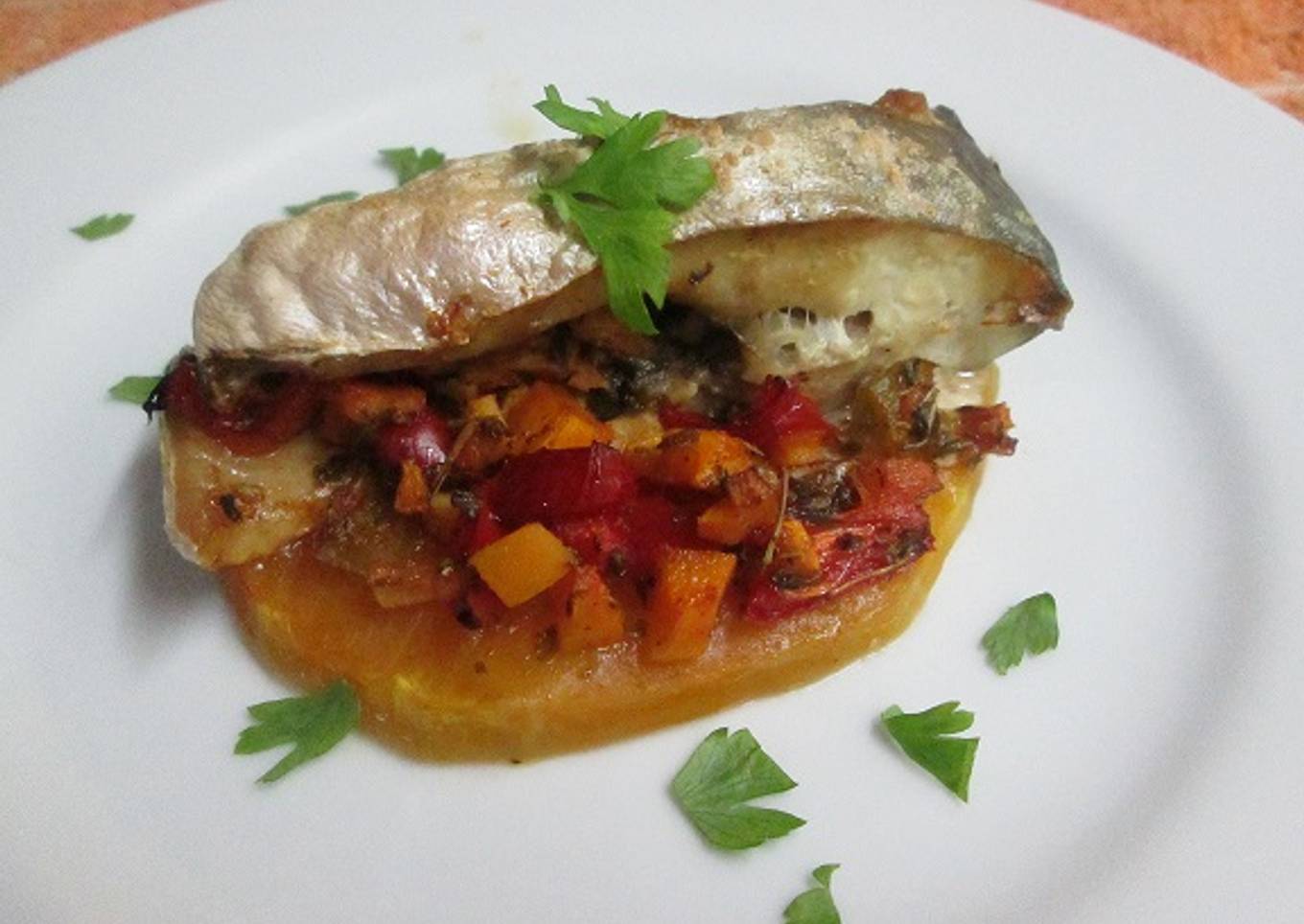 - Lo que sobre de verduras poner sobre los discos de calabaza, a los lados de las rodajas de pescado.