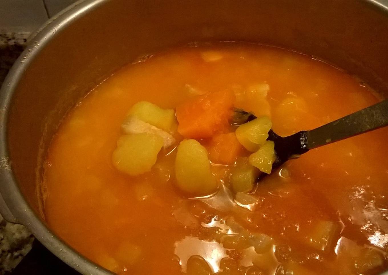- Mientras hierve lo anterior, vamos pelando las patatas y la calabaza y partiendo a trocitos. La calabaza se deshace con facilidad así que yo lo que hago es partir un par de trozos más grandes y el resto pequeños ya que me gusta que quede el caldo espesito con ella.