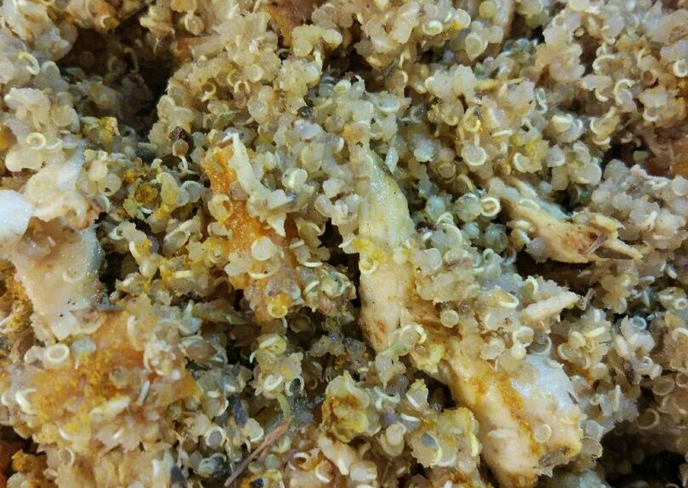 - Añadir el pollo y la calabaza (ya cocinados) en una sartén, añadir la quinoa y las especias al gusto y remover todo para integrarlo bien