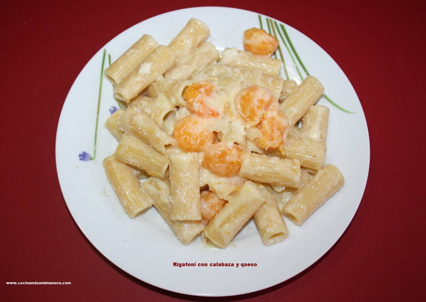 - Mientras podemos ir cociendo el rigatoni con abundante a gua y sal durante 12-14 minutos aproximadamente, en los paquetes pone el tiempo de cocción todo depende que te guste al dente o más cocida. Escurrimos y ahora añadiremos una cebolla que estamos pochando y a la que añadiremos las bolitas o trozos de calabaza, rehogaremos todo junto y añadiremos a la pasta cocida, a la que también añadiremos la salsa de queso.
