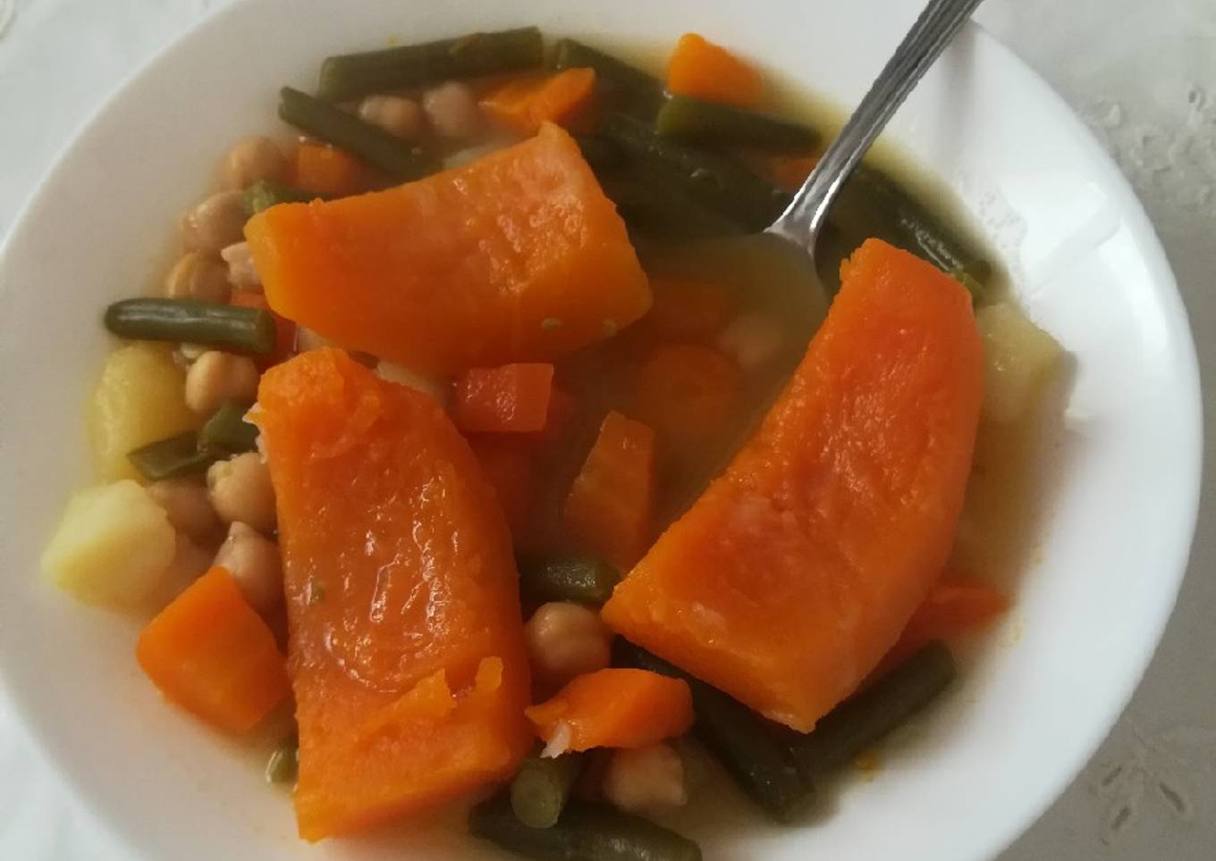 - Cuando las judías verdes y las zanahorias estén tiernas sobre los 10 minutos, vertemos las patatas. A los 15 minutos añadimos los garbanzos e incorporamos la calabaza encima del cocido y dejamos cocer otros 15 minutos. Estas cantidades de ingredientes es para repetir otro día y así optimizamos el tiempo en la cocina.