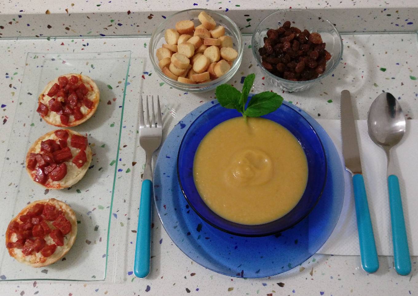 Crema de judías verdes con calabaza y mini pizzas de chorizo ibérico