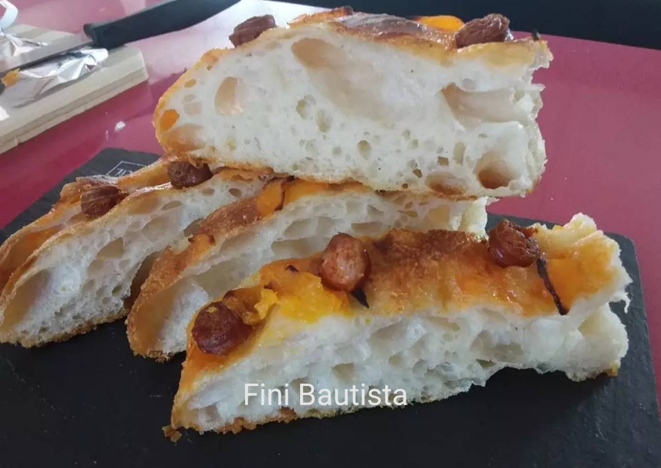 - Volvemos a hundir los dedos a la vez que le incorporamos la chistorra y la calabaza horno precalentado 240 grados calor solo abajo, con un recipiente para poner agua a la vez que ponemos la focaccia para que cree vapor, 15 minutos en esa temperatura y con vapor sacamos el vapor ponemos calor arriba y abajo por 18 minutos más, 10 minutos con el horno apagado y la puerta entreabierta