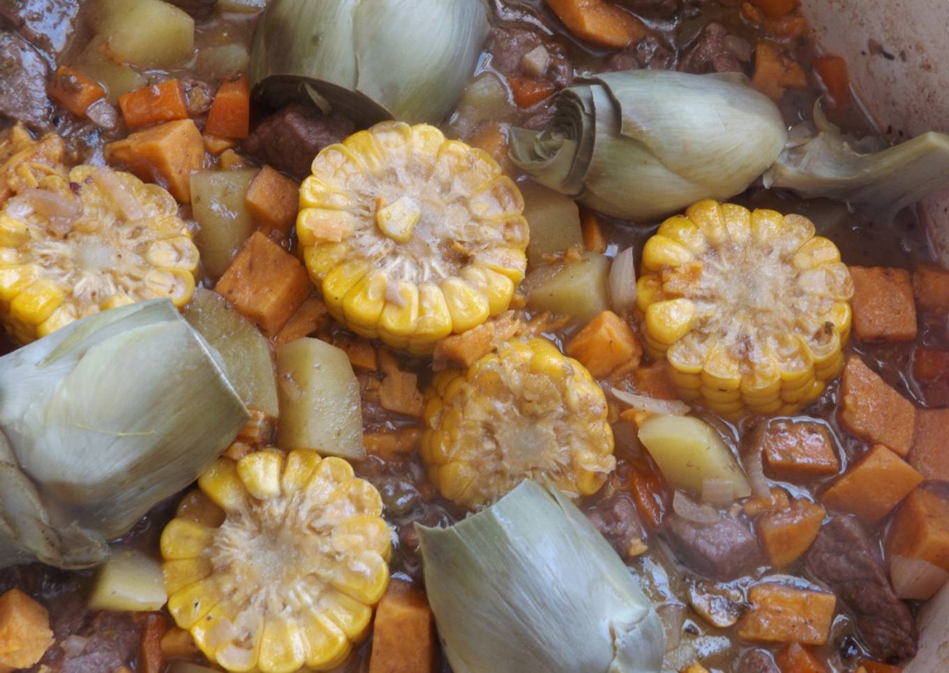 - Incorporar el vino y evaporar. Cubrir con agua caliente y cocer a fuego medio. Añadir los trozos de choclo y seguir la cocción. Cuando la carne esté tierna apagar el fuego y poner las alcachofas. Este plato está mucho más sabroso de un día para otro.