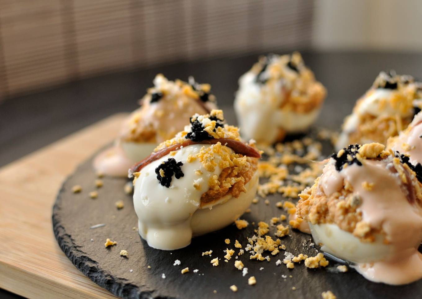 - Cortamos en tiras finas las anchoas que habíamos reservado y colocamos encima de los huevos, ponemos también un poco de sucedáneo de caviar, rallamos la 1/2 yema y un poco de queso parmesano.