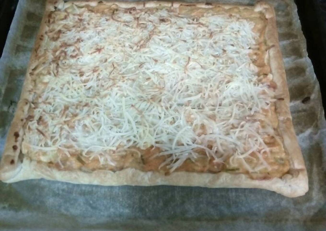 - Añadimos el queso crema. Mientras preparamos la masa de hojaldre. La estendemos, le doblamos los bordes en todos los lados. La pinchamos del centro y la introducimos al horno a 220° C. Asta que se dore.