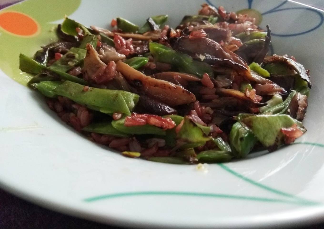 Arroz rojo salteado con setas y vainas