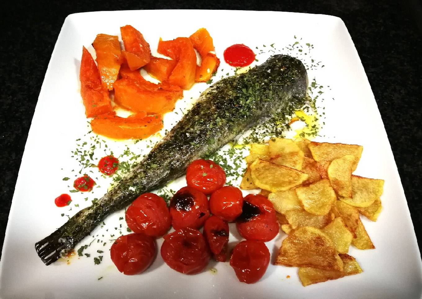 - Retirar la bandeja del horno y emplatar. Acompañar con la salsa de pimiento asado y las patatas fritas. Espolvorear el perejil seco que queda por encima y buen provecho!