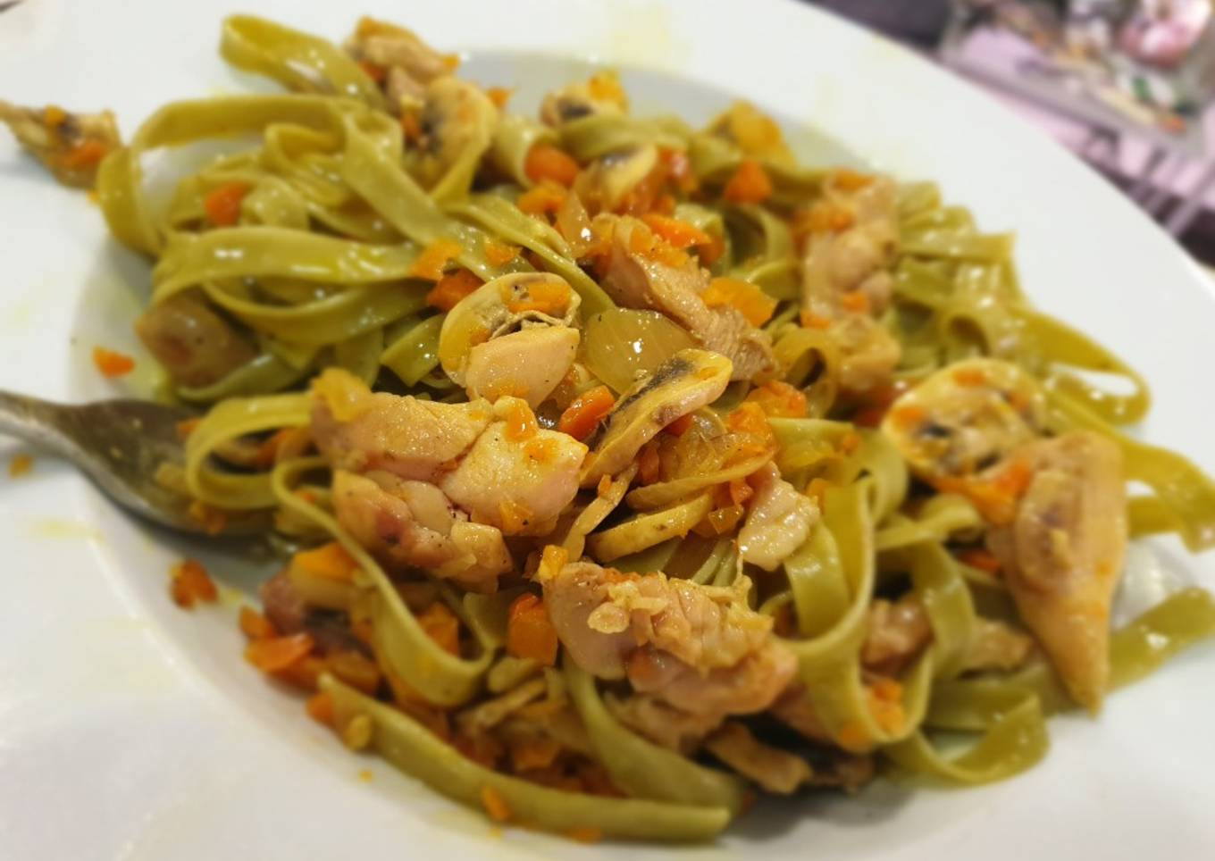 - Añadimos el pollo troceado y los champiñones laminados (a mi me gusta que se queden con textura), la sal, la pimienta, la cúrcuma y el curry