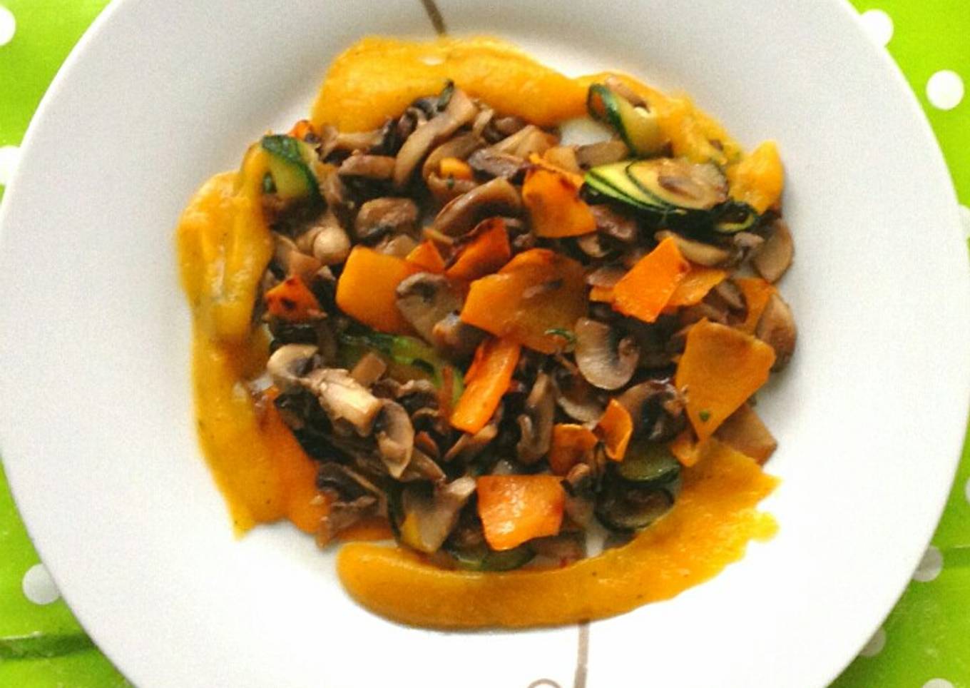 - Se puede acompañar con puré de calabaza y calabacín. La mezcla de las verduras salteadas con la textura de un puré espeso queda muy rica. Para hacer el puré, poner a hervir en un poco de agua unos trozos de calabacín y calabaza, sal y hierbas provenzales y una cucharadita de levadura de cerveza. Triturar con la batidora y añadir alrededor de las verduras al emplatarlas.